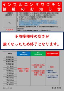 2025【院内掲示】インフルエンザワクチン接種終了について
